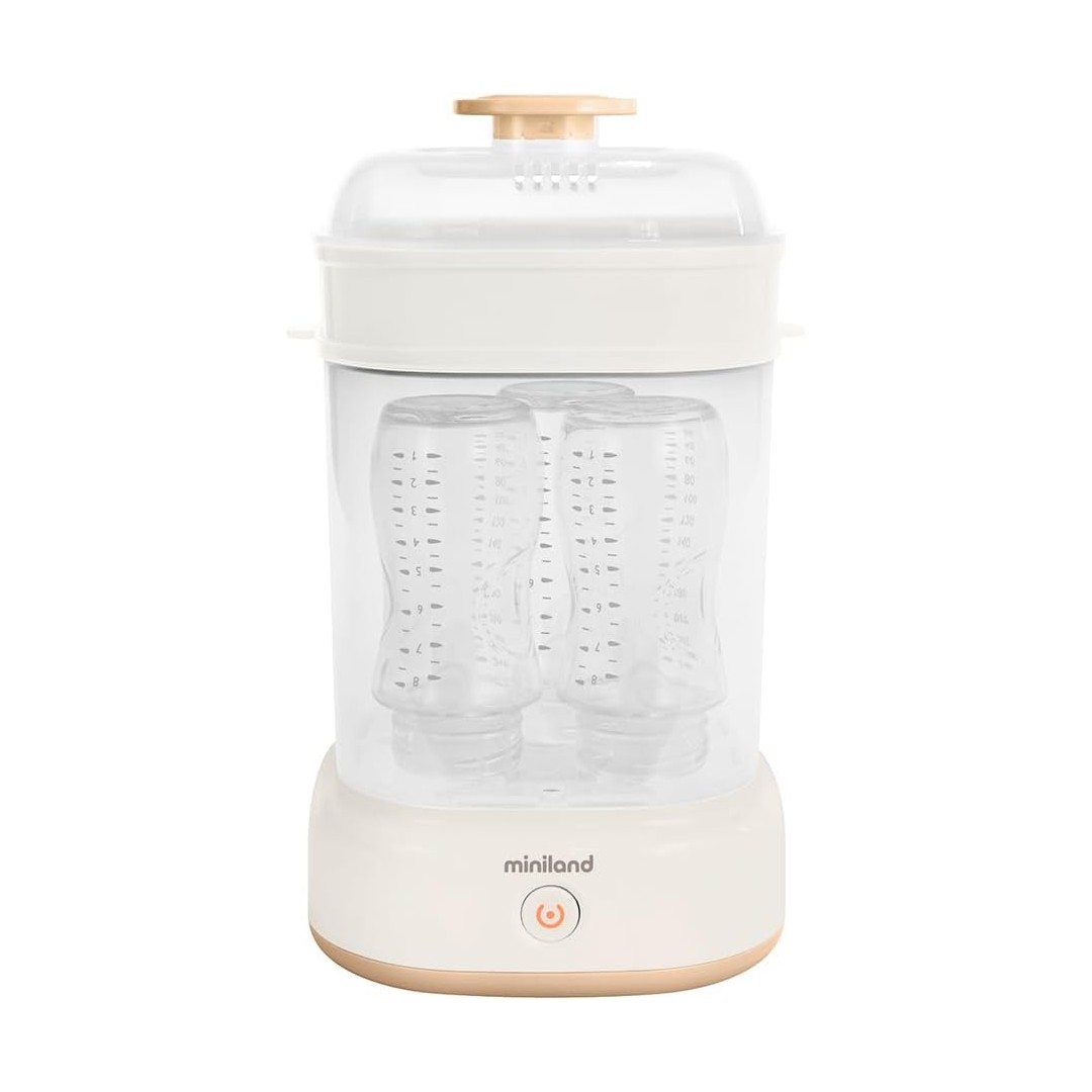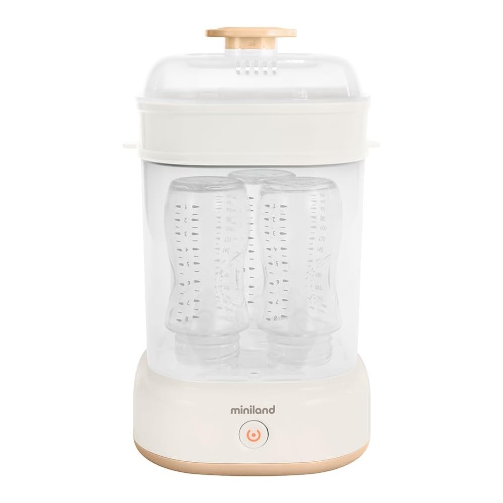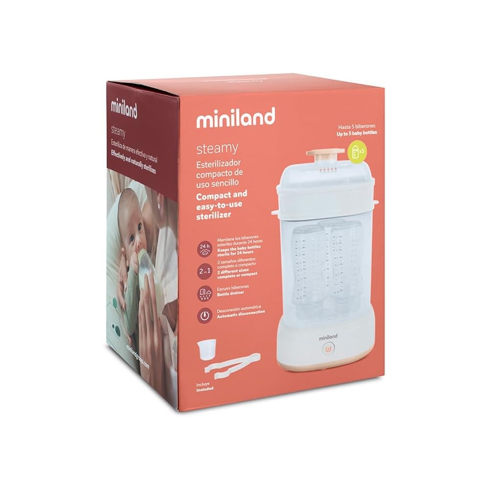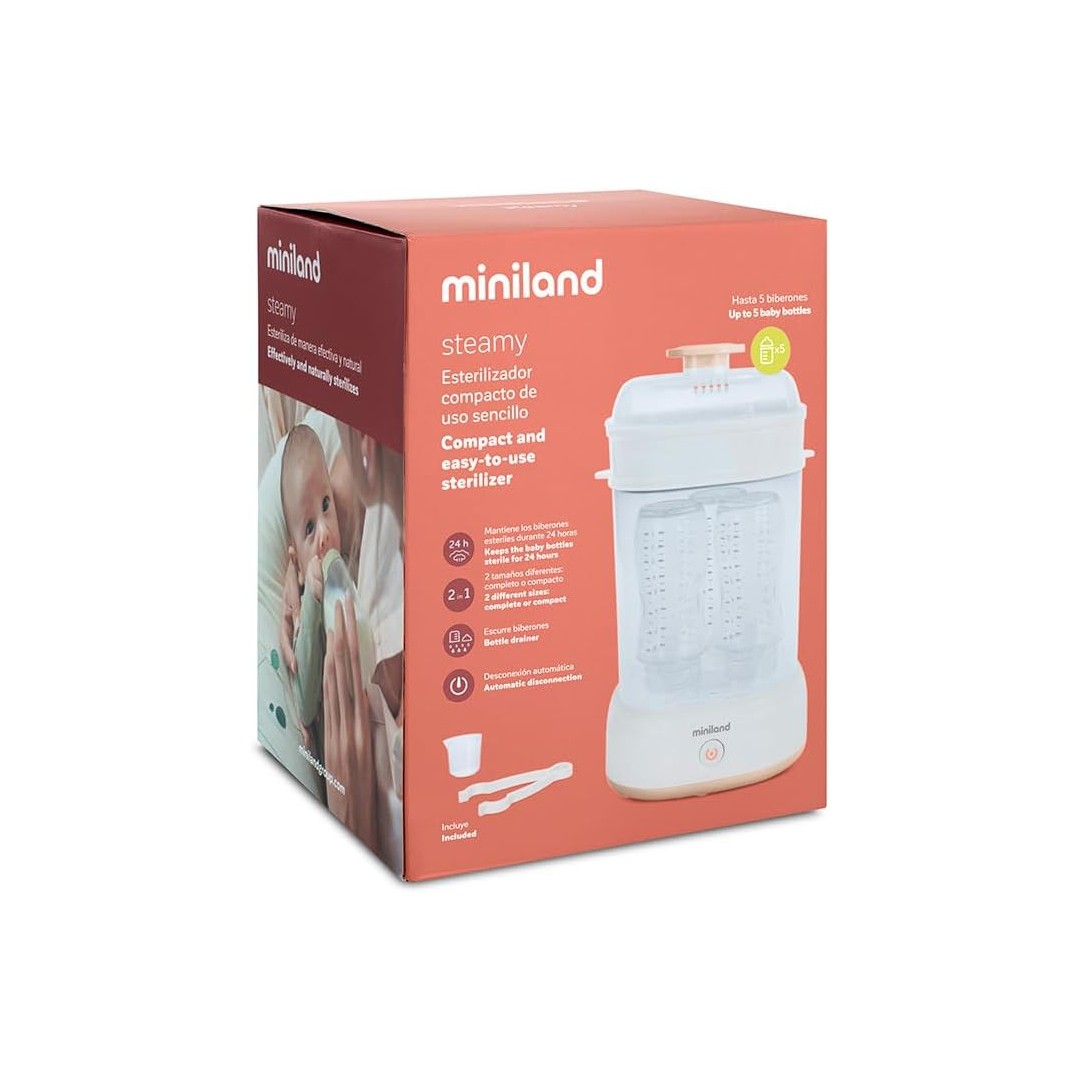 With Miniland Steamy Steam Sterilizer, it will not be necessary to add any chemicals for sterilization. Through Miniland Steamy Steam Sterilizer, all your baby's accessories and bottles will be clean and ready to be reused in just 8 minutes. You can sterilize small items such as pacifiers or teats that can be placed in the accessory tray. All accessories can be stored inside the sterilization bell and can be washed in the dishwasher. This sterilizer allows you to sterilize up to 5 bottles at the same time. The package contains: 1 sterilizer, 1 pliers.